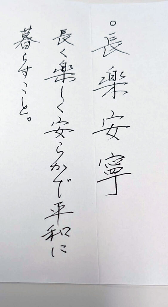 3文字、あるいは4文字の候補の中からA氏と話し合った結果、選んだのが「長楽安寧」でした。
